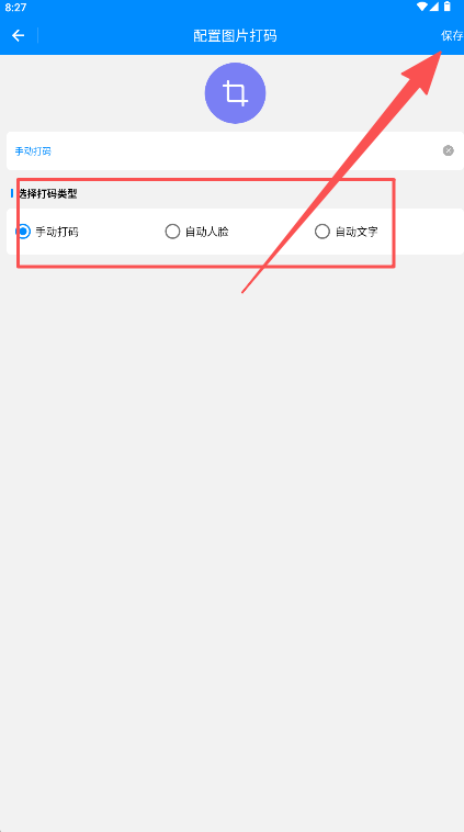 3、在配置页面选择“手动打码”类型,调整参数后点击右上角“保存”完成隐私处理。