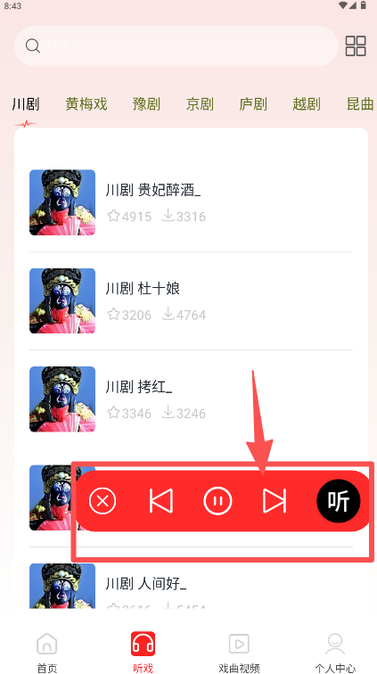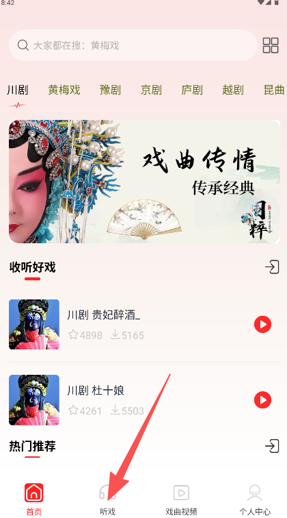 1、在首页底部导航栏中,点击“听戏”图标进入音频播放页面。