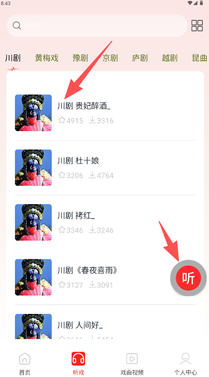 2、在听戏页面浏览戏曲列表,选择目标剧目如“川剧 贵妃醉酒”,点击右侧“听”。
