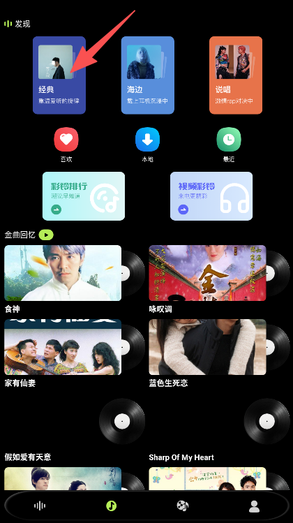 1、在首页页浏览推荐卡片,点击“经典”卡片进入经典曲库。