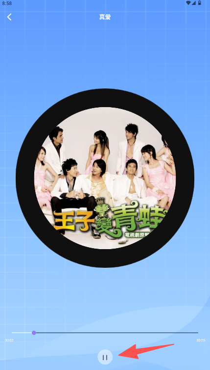 3、进入播放页可查看专辑,点击红色箭头指向的暂停按钮可控制播放状态。