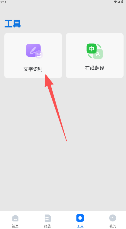 1、在应用“工具”页面点击“文字识别”按钮进入。