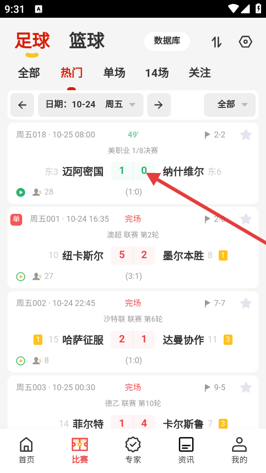 3、在比赛板块,选择感兴趣的赛事,如迈阿密国际对阵纳什维尔的比赛。