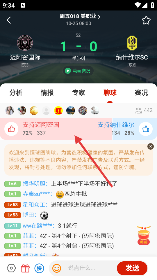 4、进入赛事详情页后,可查看比赛实时赛况、球迷聊球互动等内容,还可参与支持球队的互动。