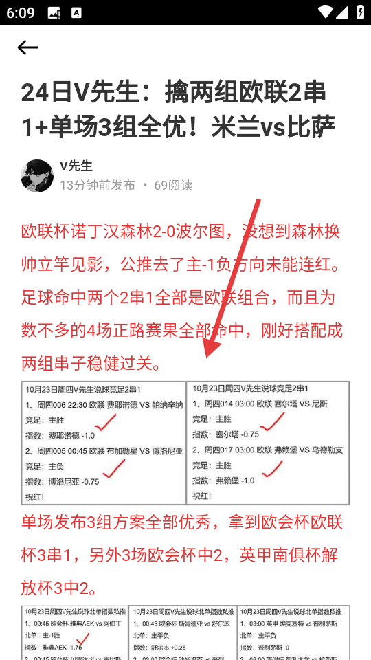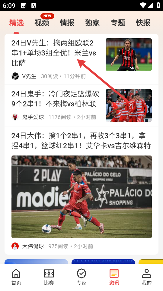 3、在资讯板块,选择感兴趣的资讯条目,如“24日V先生:擒两组欧联2串1+单场3组全优!米兰vs比萨”。
