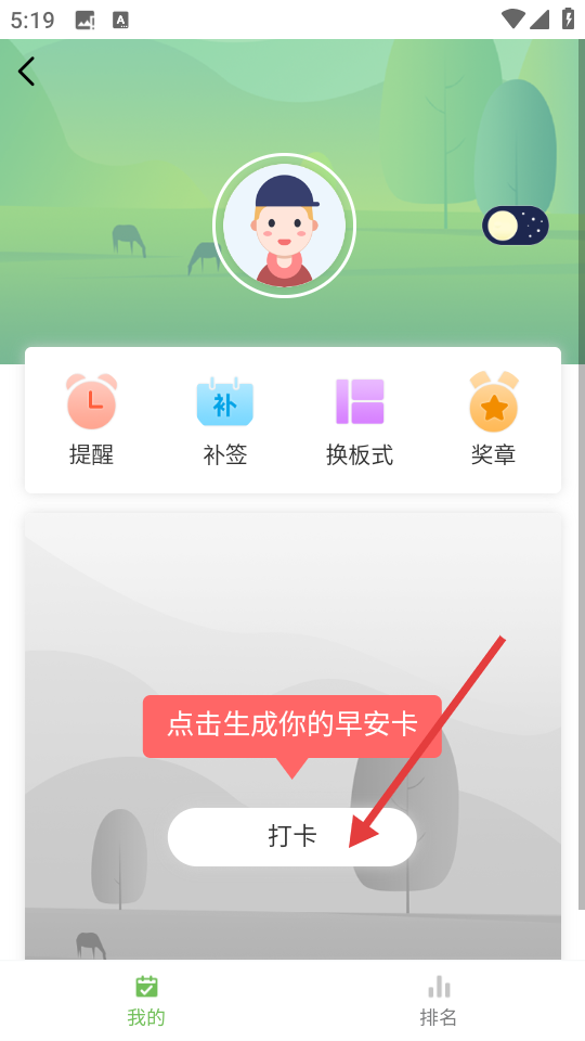2、在日签打卡页面点击【打卡】按钮,生成早安卡。