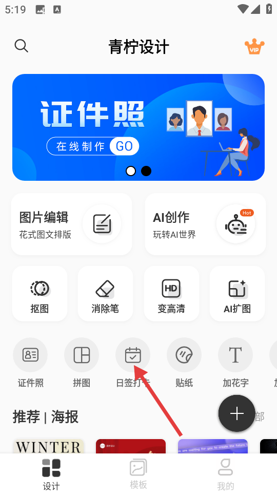 1、在青柠设计软件首页点击【日签打卡】图标,进入日签打卡页面。
