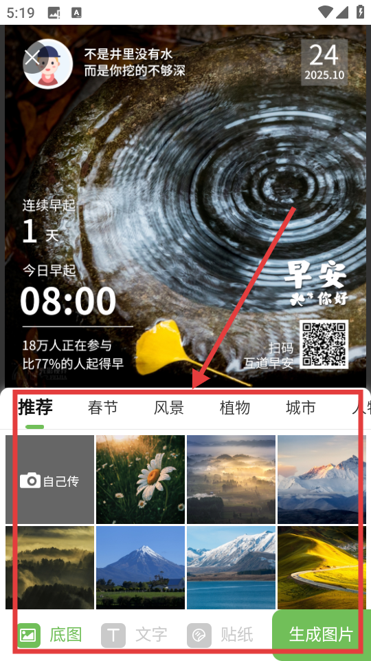 4、在底图选择页面可选择推荐、风景、植物等分类的底图,也可自己上传图片,选择后点击【生成图片】按钮完成日签制作。