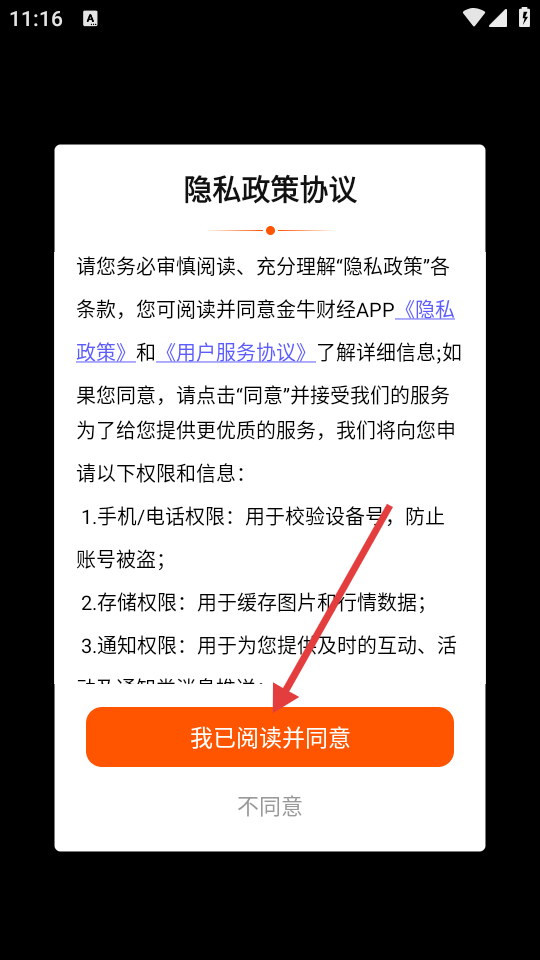 1、使用前需阅读并同意《隐私政策》和《用户服务协议》,点击【我已阅读并同意】即可进入软件。