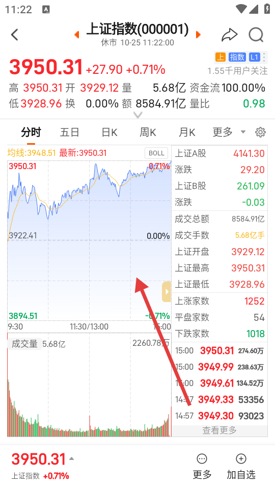 4、在上证指数详情页,可查看其分时、五日、日K等多种走势图表,以及相关成交、涨跌家数等详细数据。