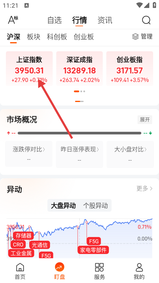 3、进入盯盘页面后,点击【上证指数】区域,可查看上证指数的详细行情数据。