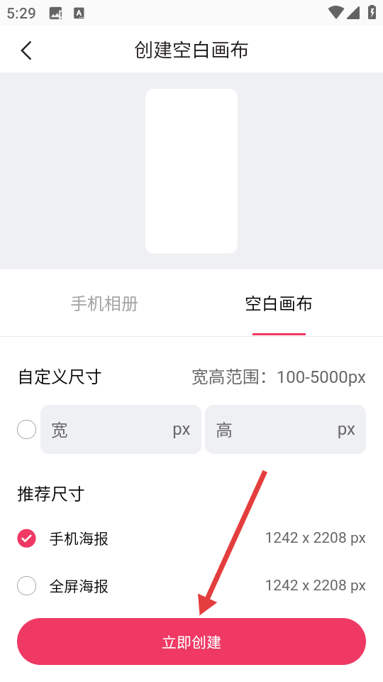 3、在创建空白画布页面,选择尺寸后点击【立即创建】按钮,可创建空白画布。