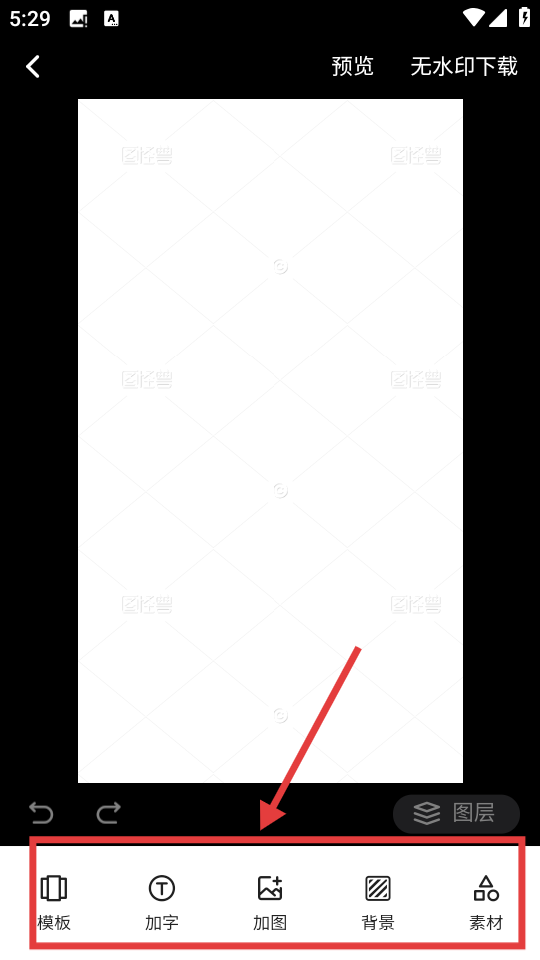 4、在空白画布编辑页面,可使用【模板】【加字】【加图】【背景】【素材】等功能进行设计编辑。