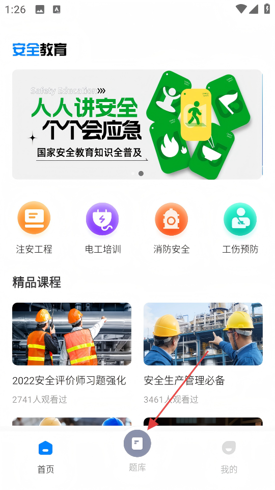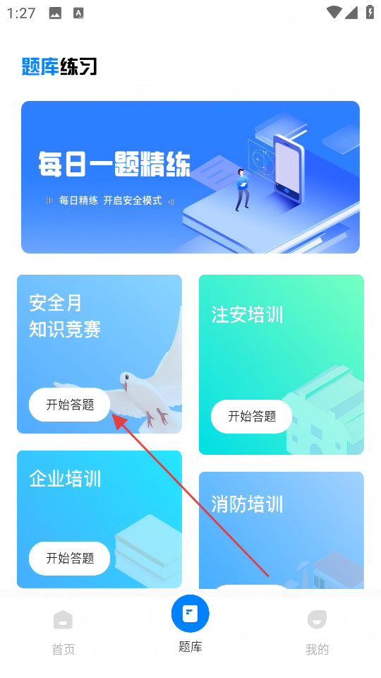 1、在软件首页点击底部【题库】按钮,进入题库练习页面。