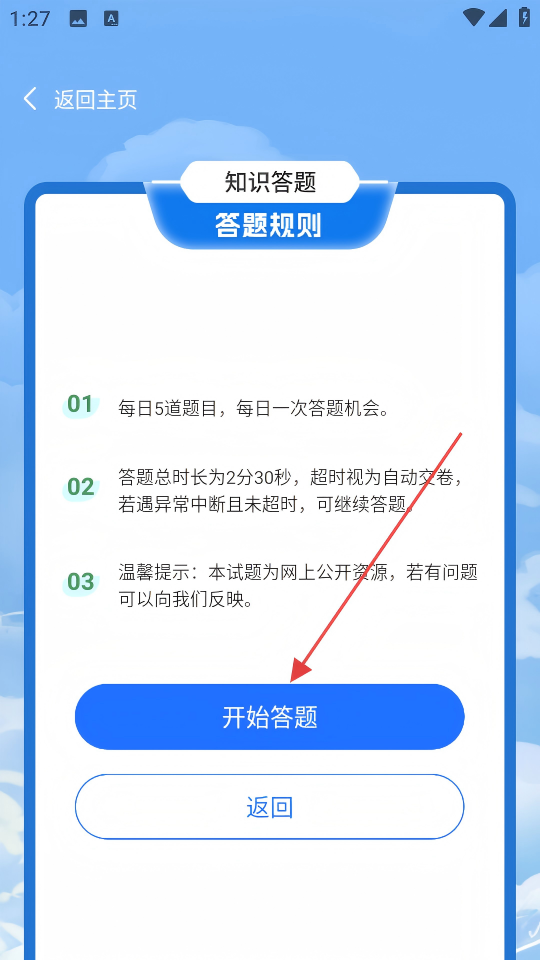3、在答题规则页面阅读规则后,点击【开始答题】按钮,进入安全知识答题环节。