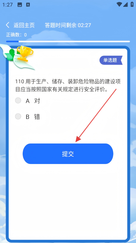 4、在答题页面完成题目选择后,点击【提交】按钮,完成安全知识答题流程。