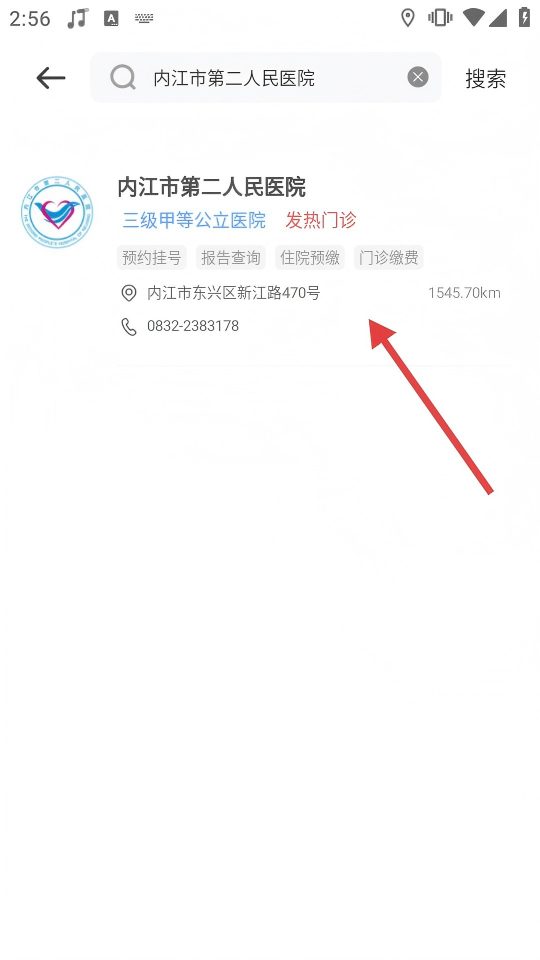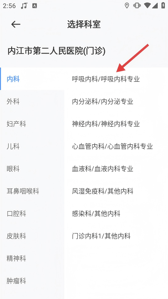2、在医院搜索页选择目标医院,进入科室选择页。