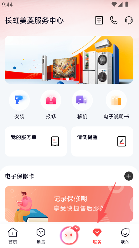 2、功能模块丰富,安装、报修、电子说明书等入口明确,同时整合服务单、清洗提醒、保修卡,售后管理维度全面。
