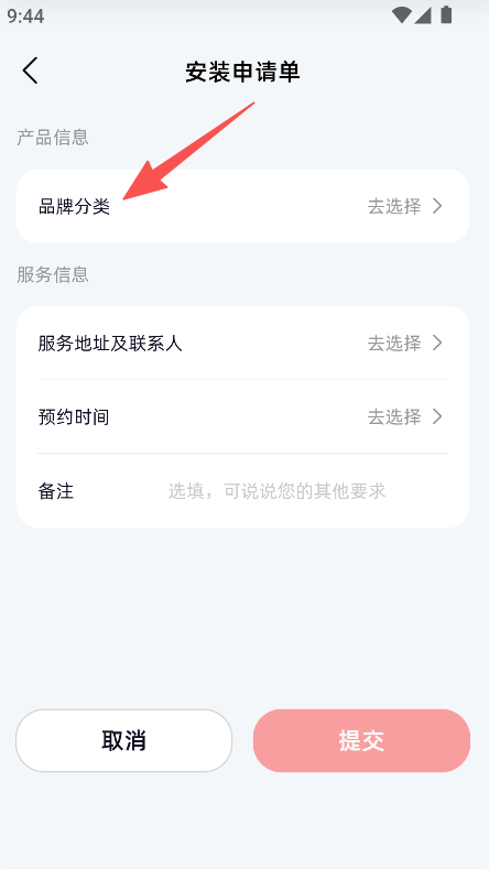 1、进入服务板块,选择安装,填写品牌分类等信息。
