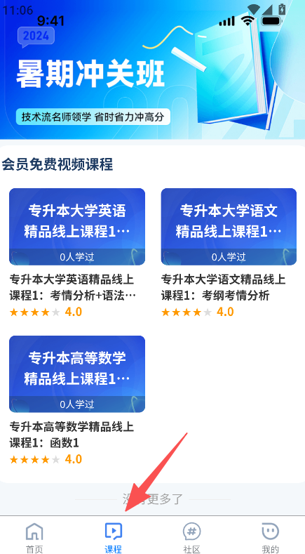 1、进入课程板块,选择专升本大学英语、语文或高等数学课程。
