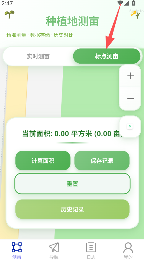 1、测亩精准高效,通过标点或实时测亩模式,快速计算土地面积,结果清晰展示平方米与亩数,满足农业种植面积测量的精准需求。