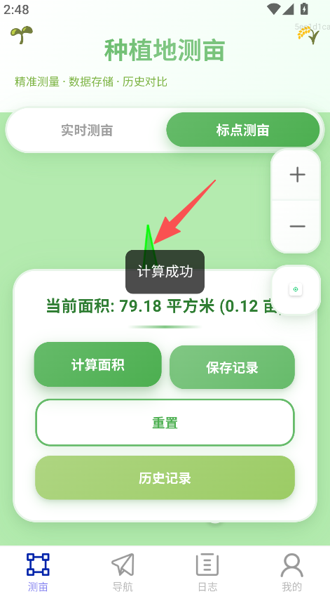 3、数据管理与植物记录联动,测亩数据可保存记录,同时搭配植物成长日志,实现土地与植物生长的协同管理,提升种植管理连贯性。