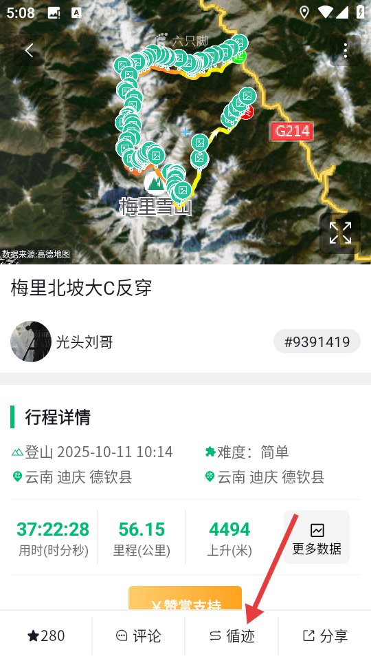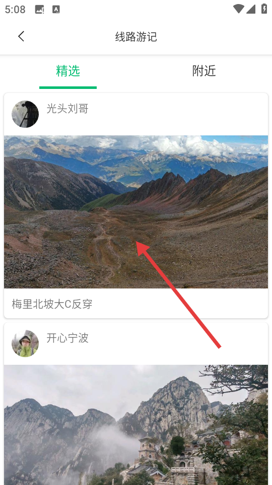 2、在线路游记页面,点击感兴趣的线路,如【梅里北坡大C反穿】,可进入线路详情页面。