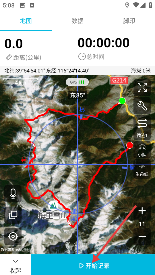 4、在循迹地图页面,点击【开始记录】按钮,可开始记录本次循迹的距离、时间等数据。