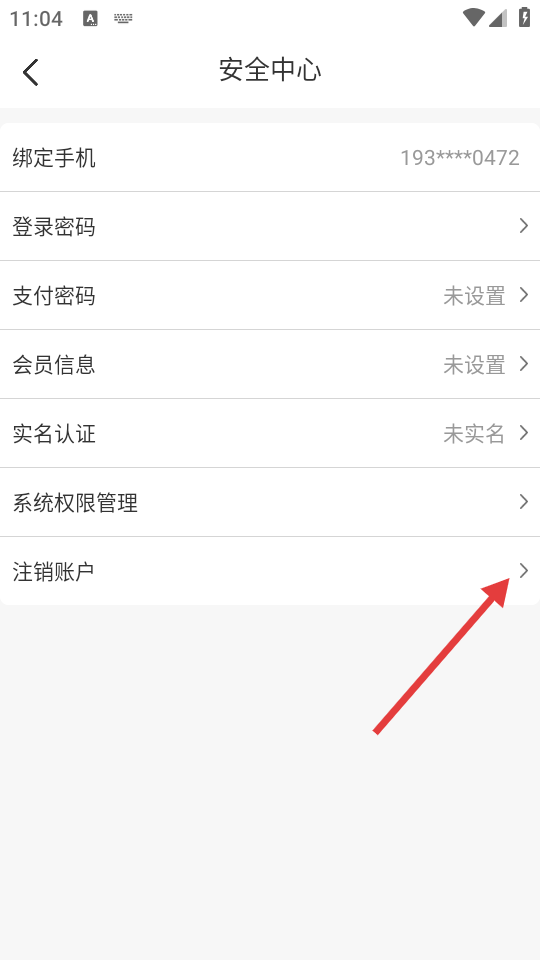 3、在安全中心页面,点击【注销账户】选项进入账户注销流程。