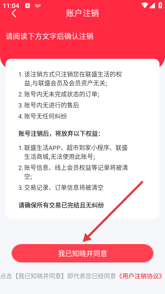 4、在账户注销页面,阅读注销说明后点击【我已知晓并同意】按钮完成注销操作。