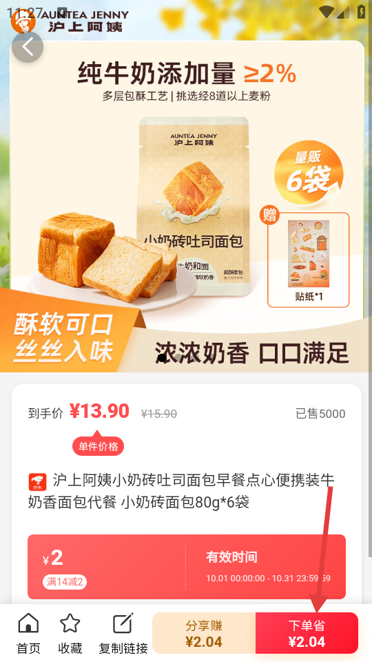 3、在商品详情页,点击【下单省¥2.04】按钮,进入领券页面。