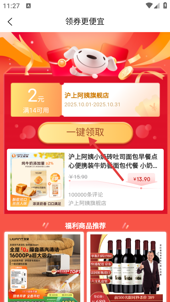 4、在领券页面,点击【一键领取】按钮,领取满14减2元的优惠券以享受优惠。