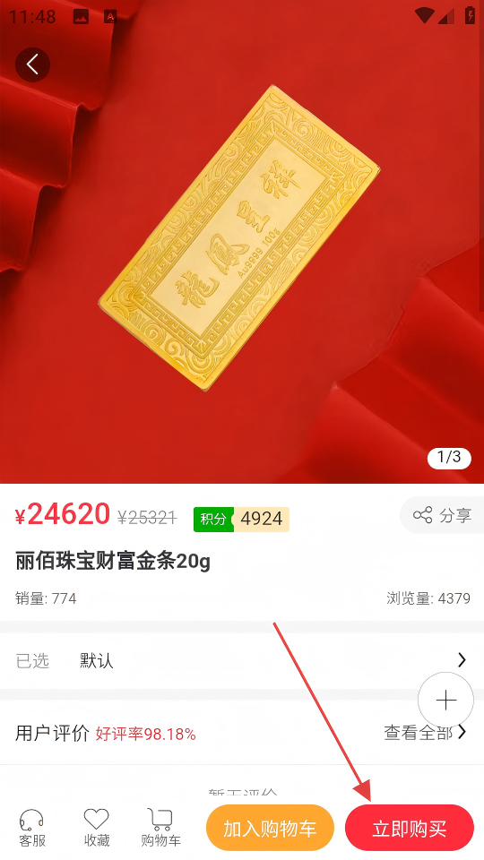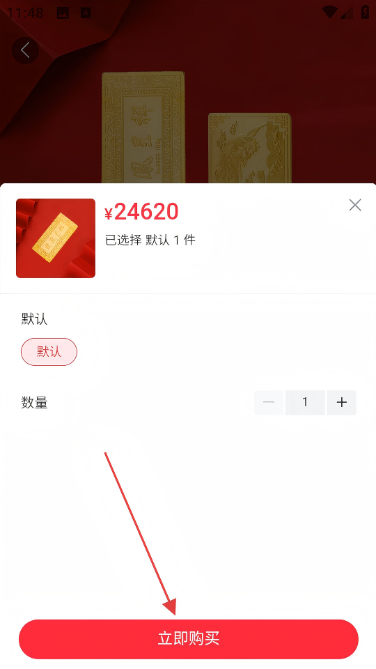 4、在弹窗中确认商品规格和数量后,点击【立即购买】,完成黄金金条的购买流程。