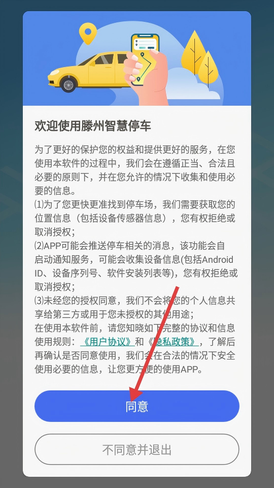 1、在隐私政策弹窗中点击【同意】,进入滕州智慧停车主界面。