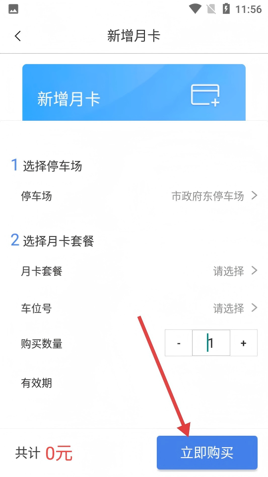 4、在新增月卡设置页选择停车场、月卡套餐、车位号等信息,点击【立即购买】,完成月卡购买操作。