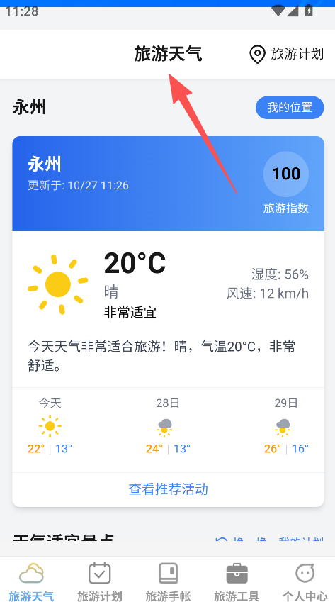1、进入旅游天气板块,查看目的地温度、天气及旅游指数。