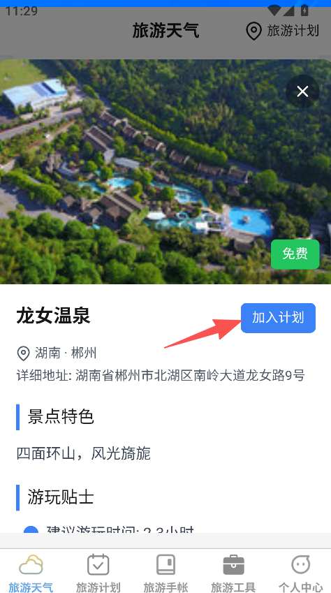 2、旅游计划功能实用,可添加特色景点(如龙女温泉),让行程规划更具针对性。