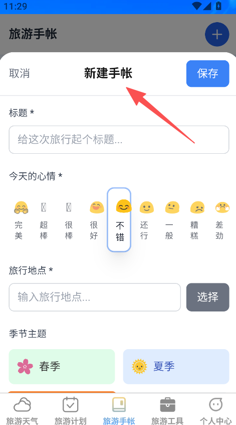 3、新建旅游手帐,填写标题、选择心情、输入旅行地点。