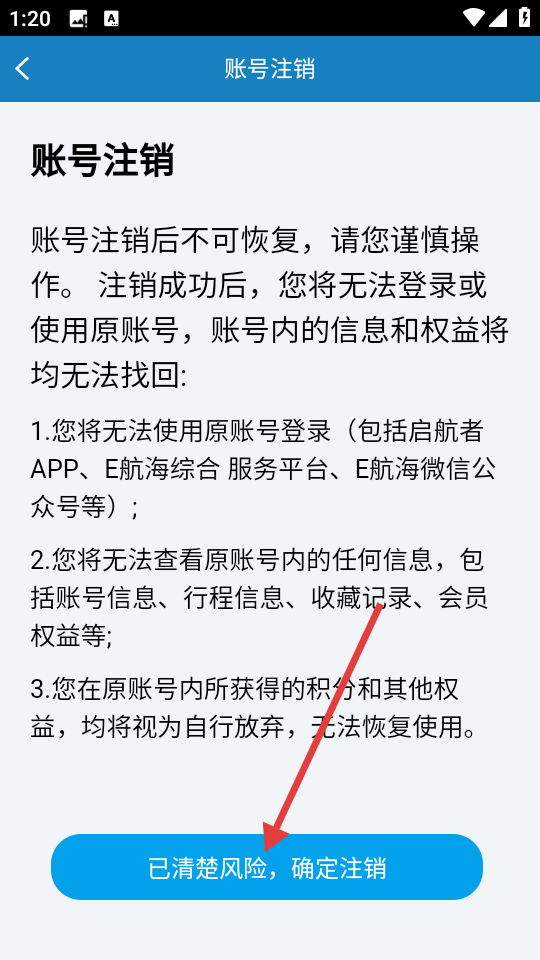 4、在账号注销页面,阅读注销说明后点击【已清楚风险,确定注销】按钮完成注销操作。
