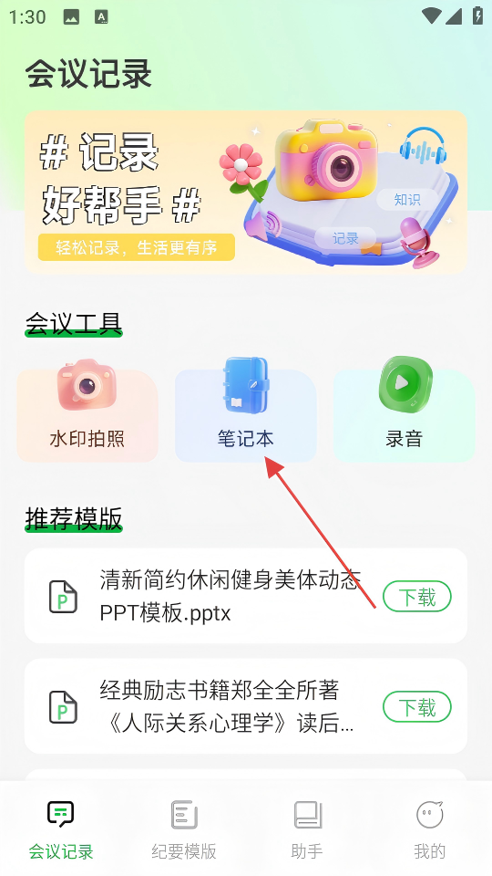 1、在会议记录页面点击【笔记本】,进入笔记本页面。