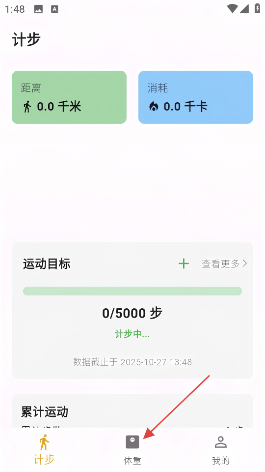1、在计步页面点击底部【体重】按钮,进入体重管理页面。