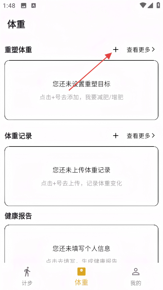 2、在体重管理页面点击【重塑体重】右侧的加号,进入体重重塑的个人信息填写页面。