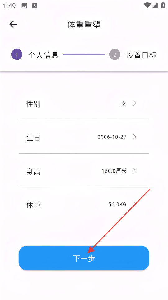 3、在个人信息页面填写性别、生日、身高、体重等信息后,点击【下一步】。