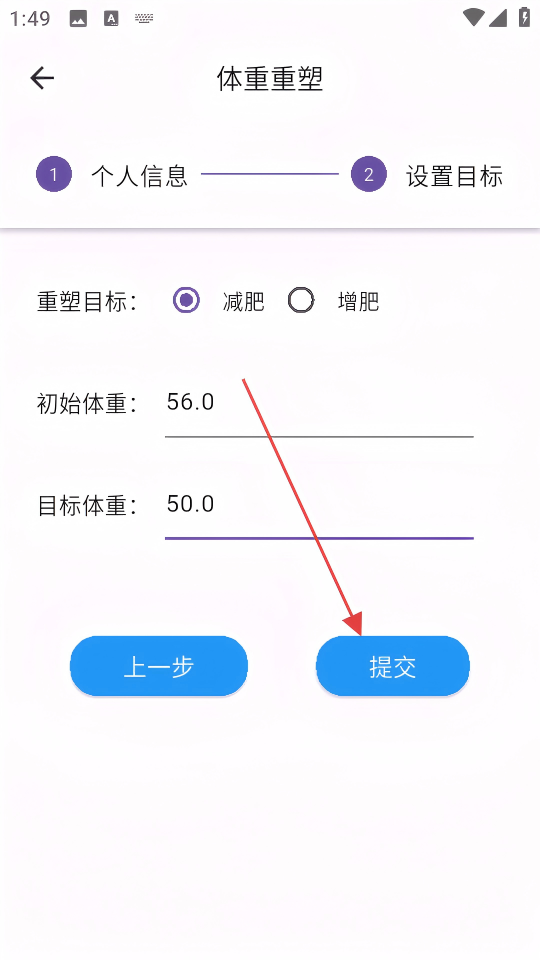 4、在设置目标页面选择重塑目标,设置初始体重和目标体重后,点击【提交】。