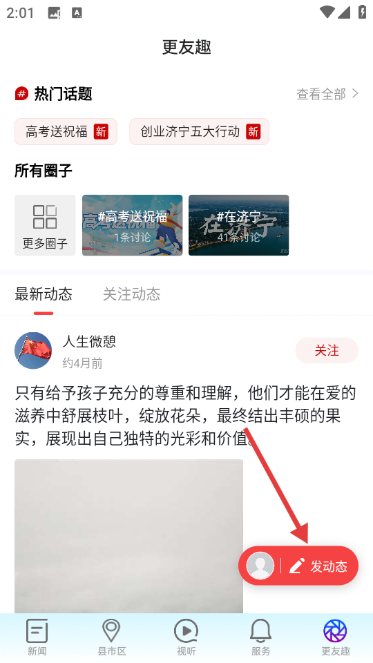 3、在更友趣页面,点击【发动态】按钮,进入动态发布界面。