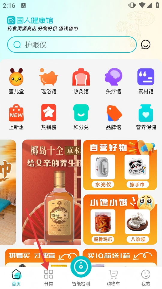 1、点击底部【分类】,进入分类页面,可查看物料专区、营养保健等各类商品分类。