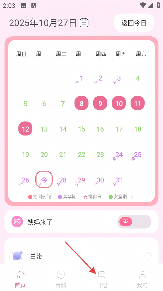 1、在APP首页点击底部【日记】按钮,进入日记页面。