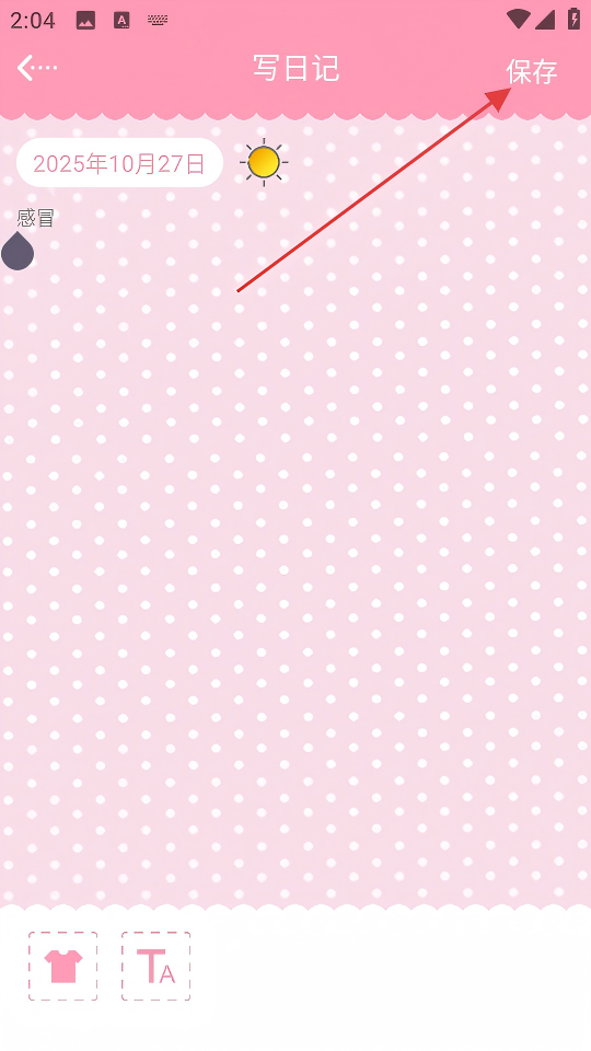 3、在写日记编辑页面填写日记内容后,点击右上角【保存】。