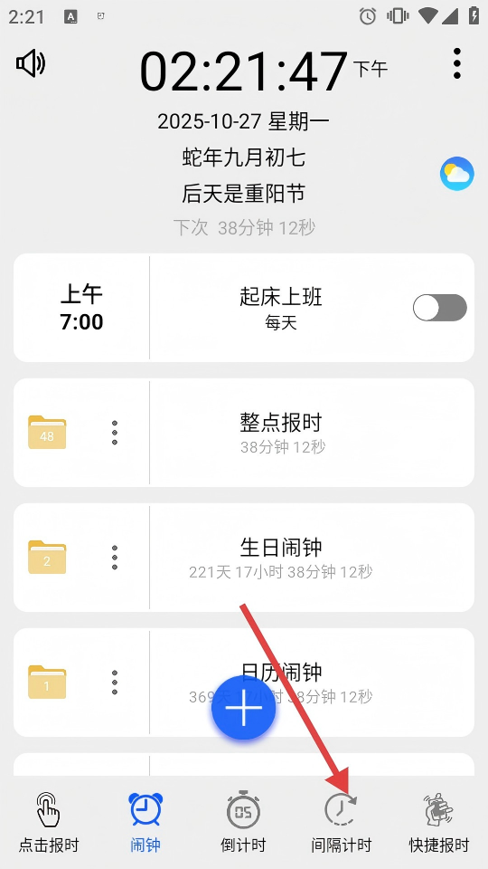 2、进入闹钟软件后,点击【间隔计时】可进入对应计时设置界面。