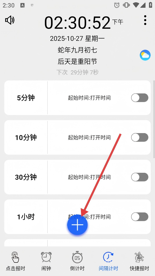 3、在【间隔计时】界面,可选择预设的5分钟、10分钟等时长,也可点击【+】号自定义间隔计时的时间参数。